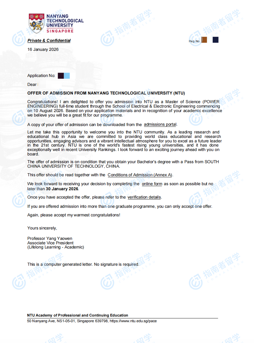 南洋理工大學(xué)電力工程理學(xué)碩士研究生offer一枚