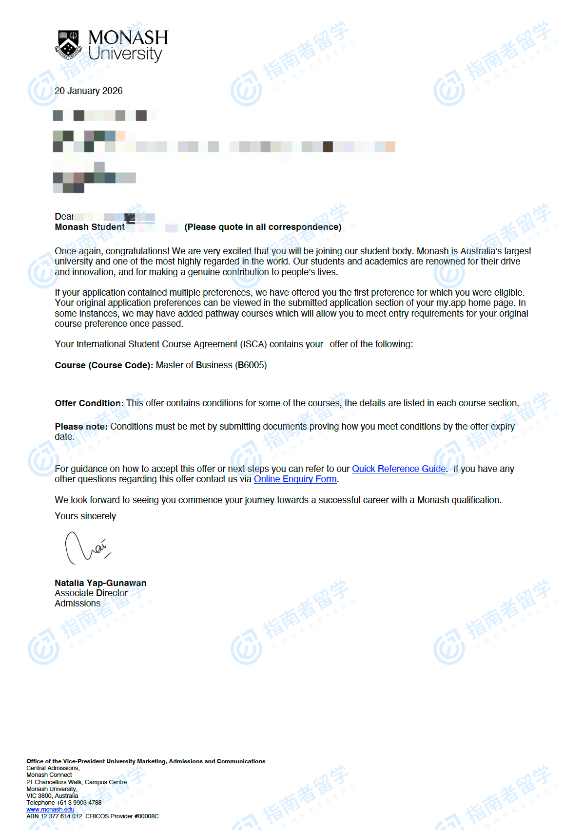 莫納什大學(xué)商業(yè)碩士研究生offer一枚