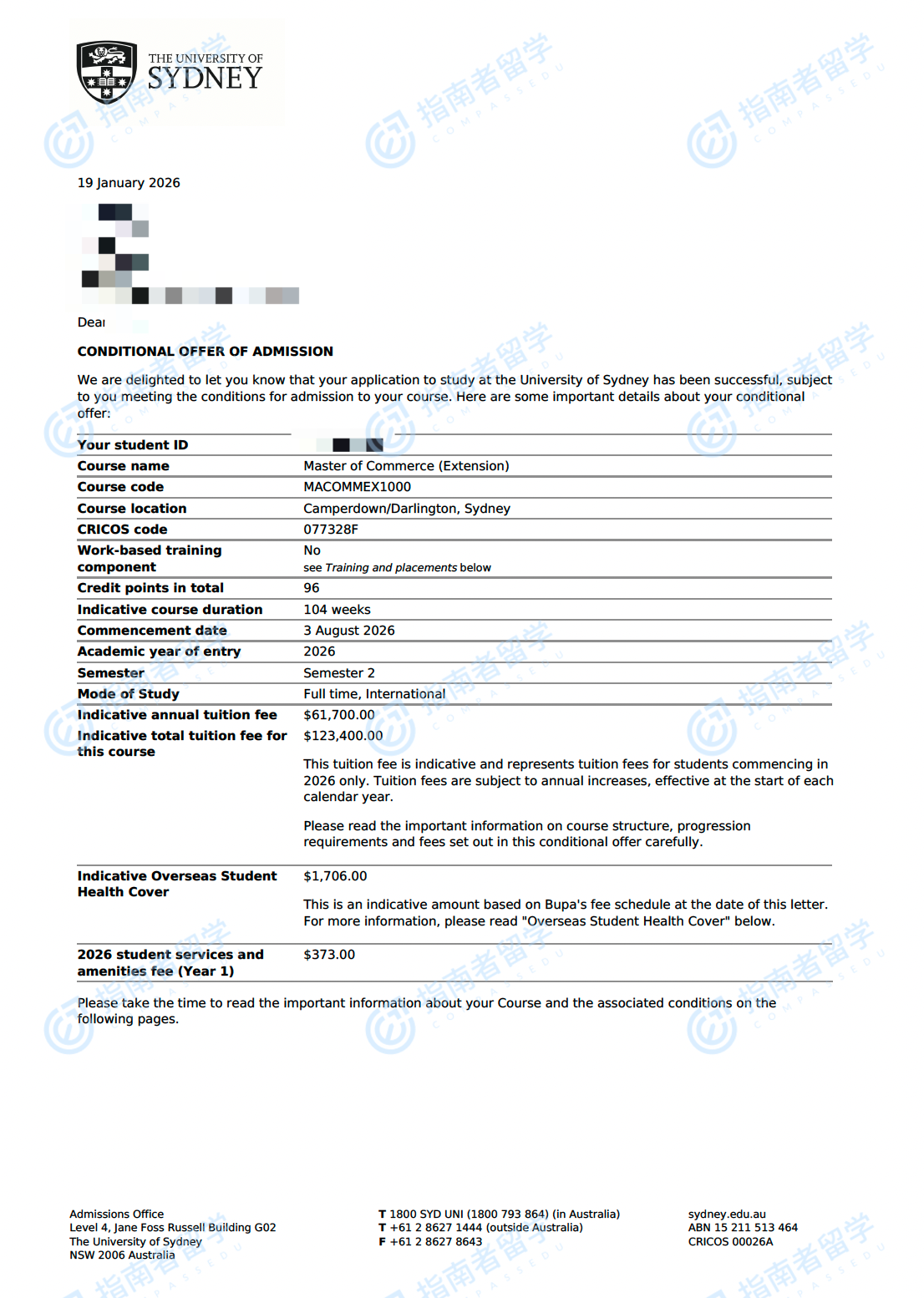 悉尼大學(xué)商學(xué)碩士(擴(kuò)展課程)研究生offer一枚