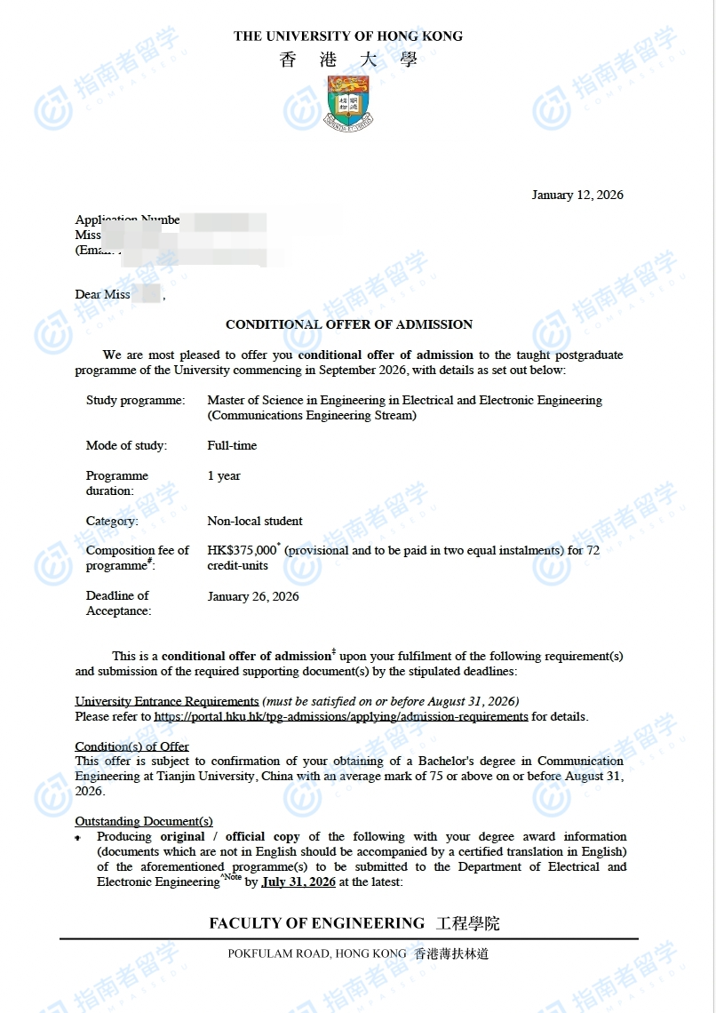香港大學(xué)電氣與電子工程(工程)理學(xué)碩士 - 通信工程方向研究生offer一枚