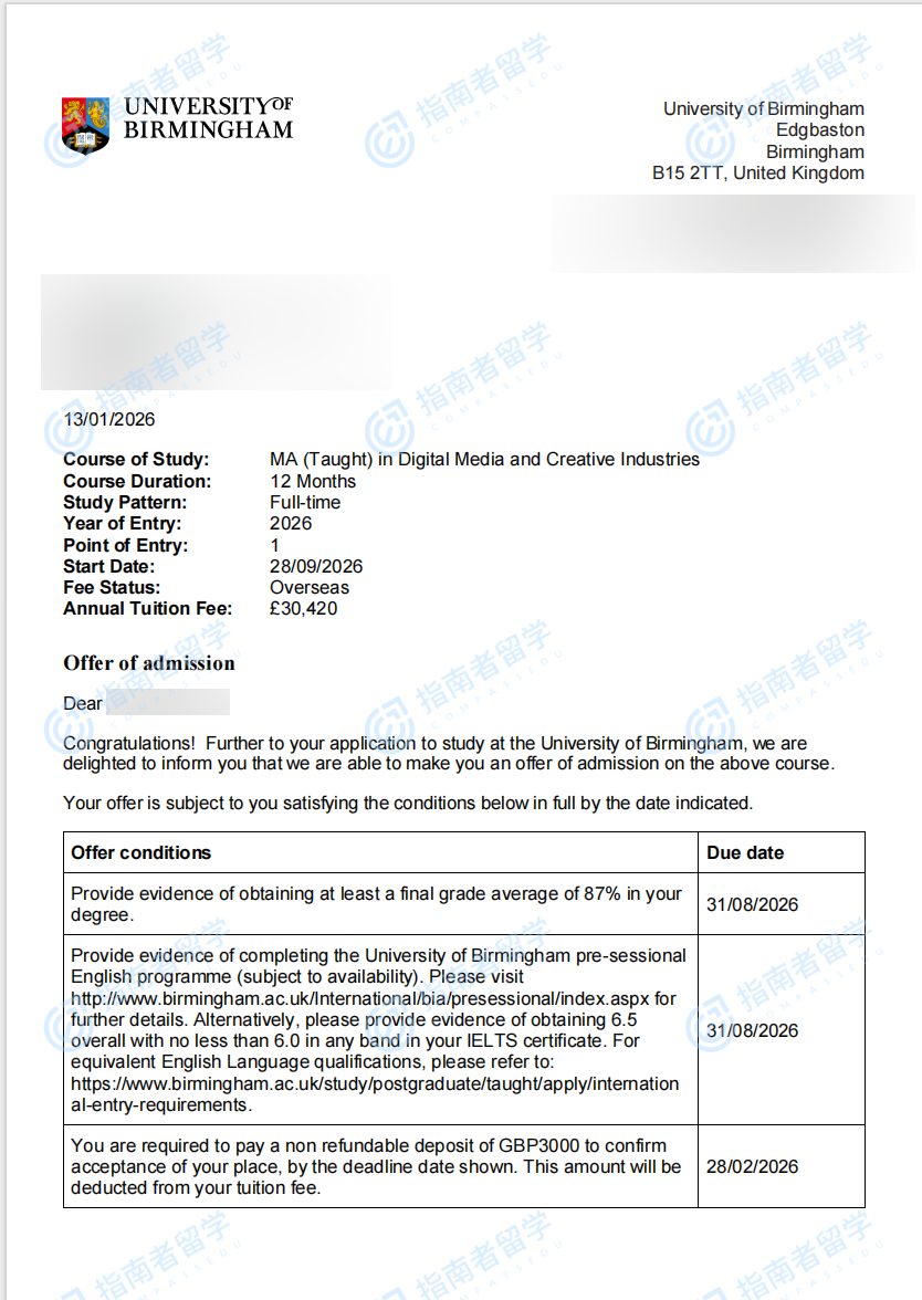 伯明翰大學數(shù)字傳媒與創(chuàng)意產(chǎn)業(yè)文學碩士研究生offer一枚
