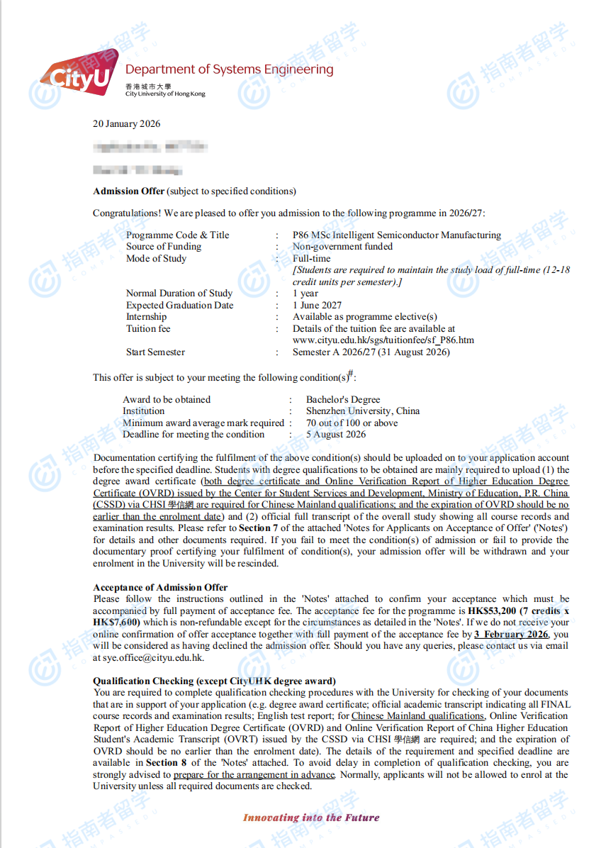 香港城市大學智能半導體制造理學碩士研究生offer一枚