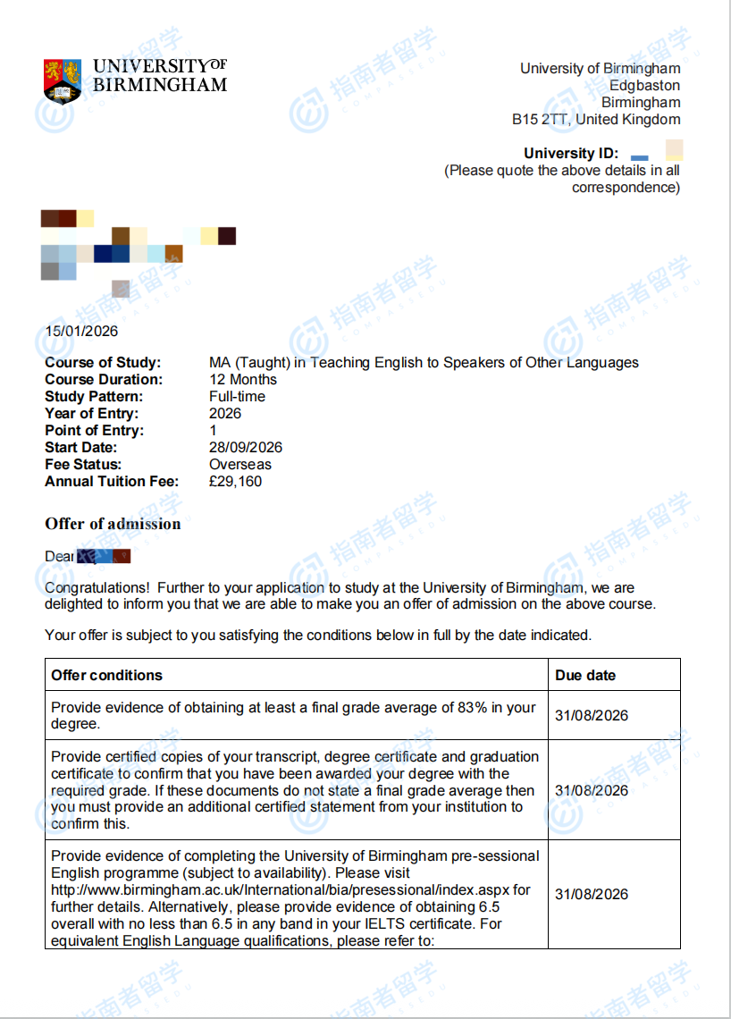 伯明翰大學(xué)對外英語教學(xué)理學(xué)碩士研究生offer一枚