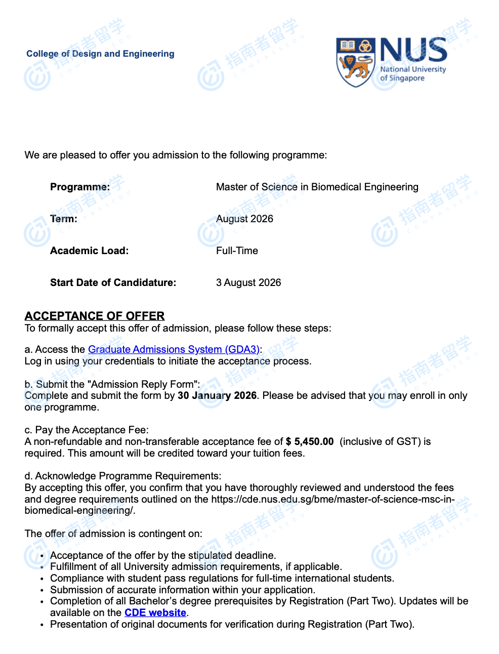 新加坡國立大學(xué)生物醫(yī)學(xué)工程理學(xué)碩士研究生offer一枚