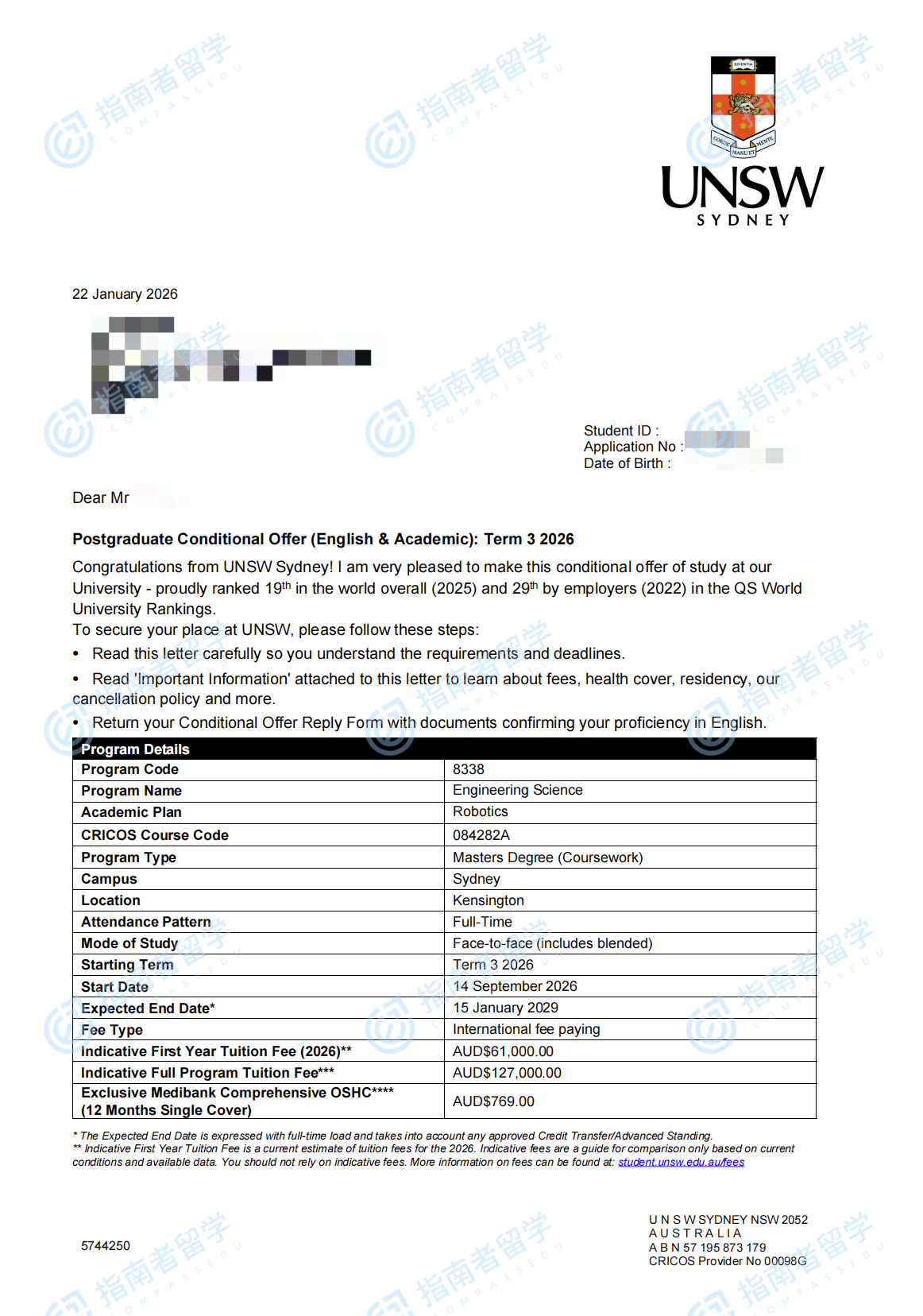新南威爾士大學(xué)工程科學(xué)碩士(機器人)研究生offer一枚