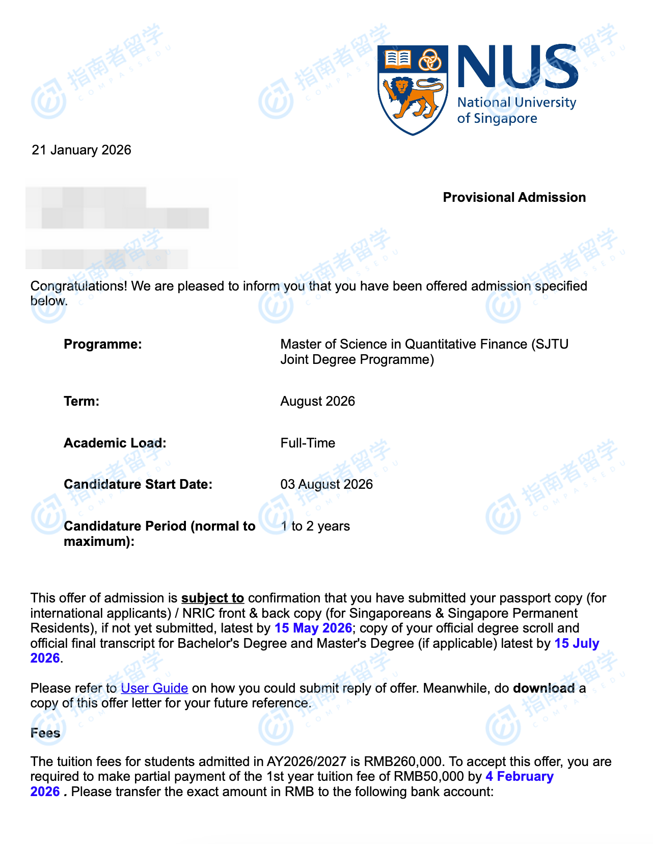 新加坡國立大學(xué)定量金融理學(xué)碩士(新加坡國立大學(xué)-上海交通大學(xué)聯(lián)合開設(shè))研究生offer一枚