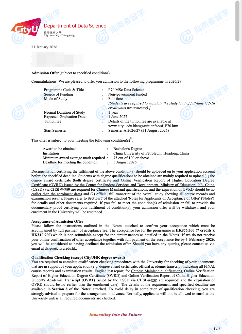 香港城市大學(xué)數(shù)據(jù)科學(xué)理學(xué)碩士研究生offer一枚