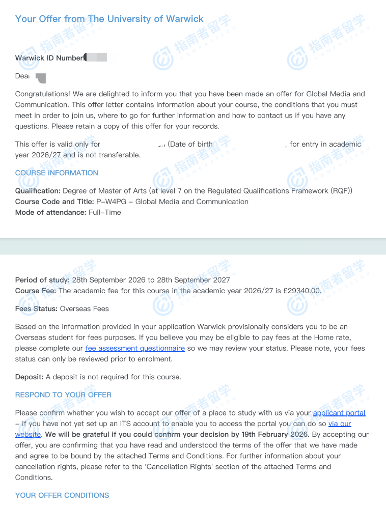 華威大學(xué)全球媒體與傳播文學(xué)碩士研究生offer一枚