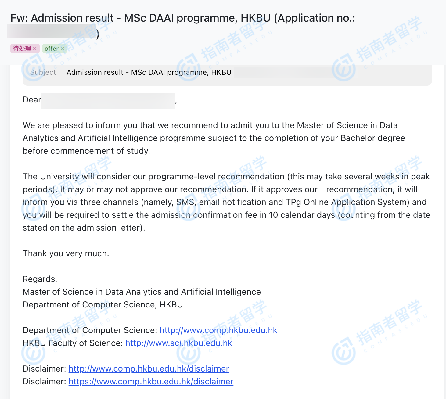 香港浸會(huì)大學(xué)數(shù)據(jù)分析與人工智能理學(xué)碩士研究生offer一枚