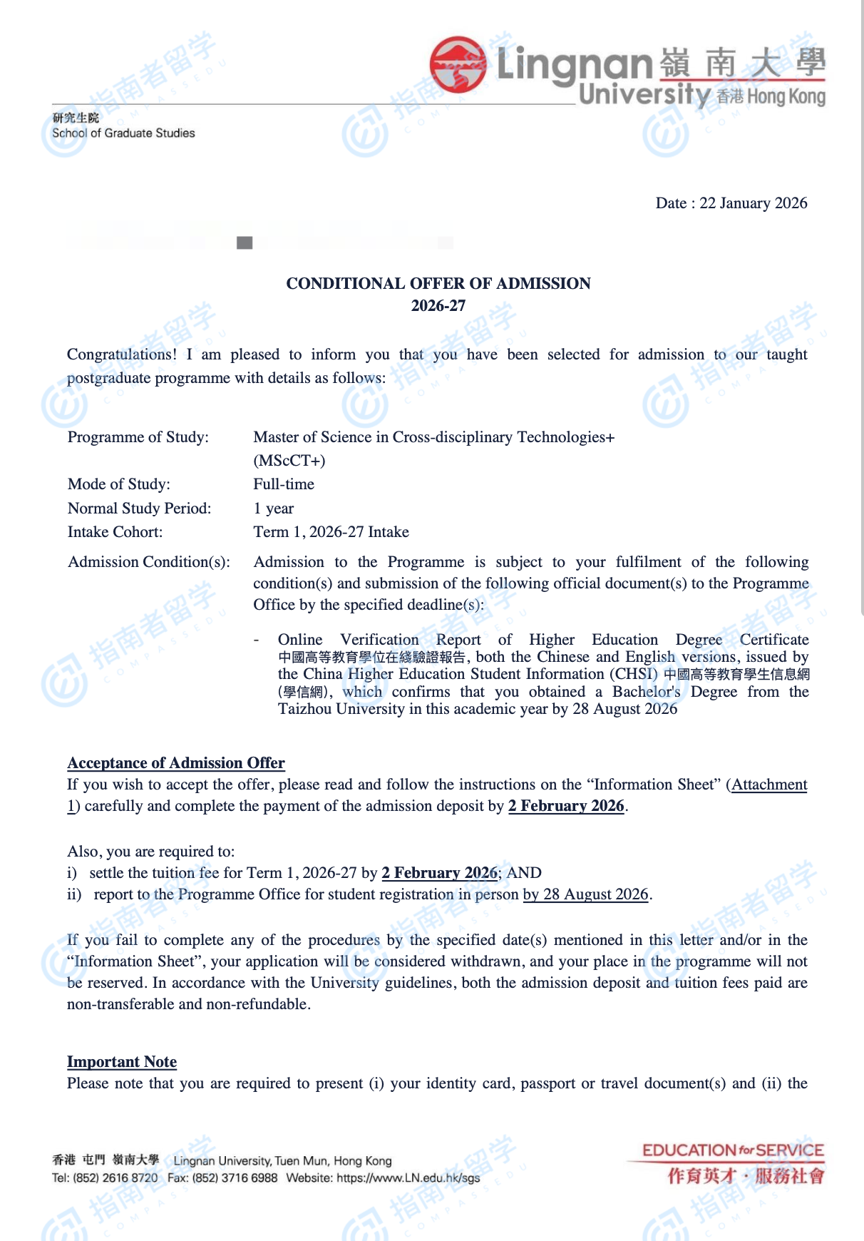 香港嶺南大學(xué)融合科技理學(xué)碩士+研究生offer一枚