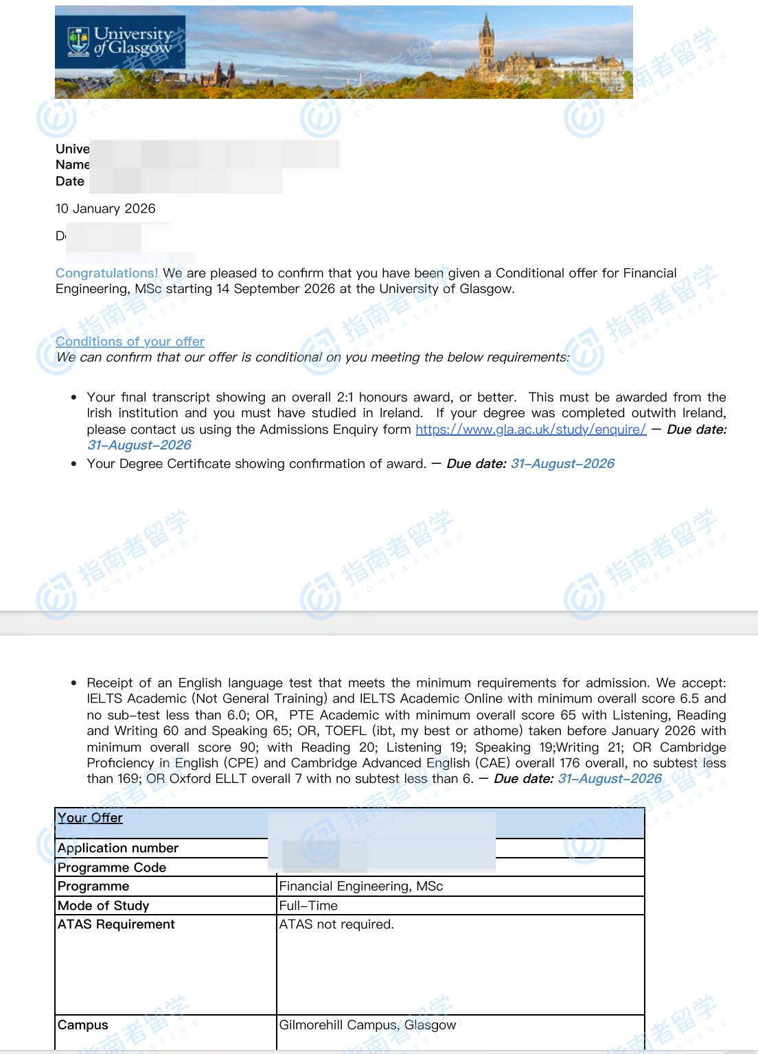 格拉斯哥大學金融工程理學碩士研究生offer一枚