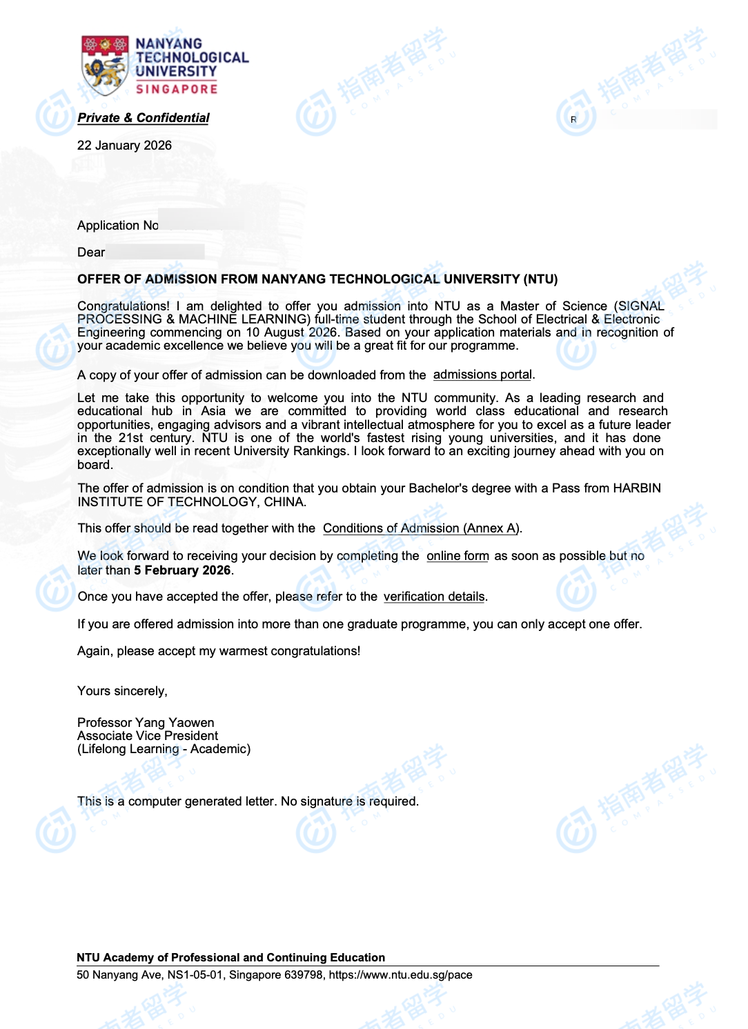 南洋理工大學(xué)信號處理和機器學(xué)習(xí)理學(xué)碩士研究生offer一枚