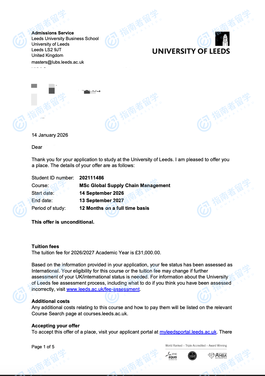 利茲大學(xué)全球供應(yīng)鏈管理理學(xué)碩士研究生offer一枚