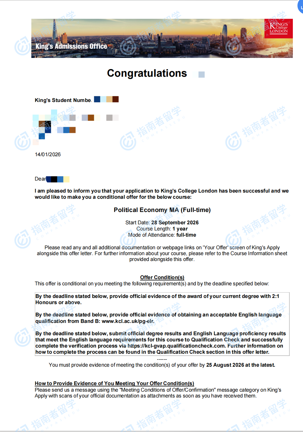 倫敦大學(xué)國王學(xué)院政治經(jīng)濟(jì)學(xué)文學(xué)碩士研究生offer一枚