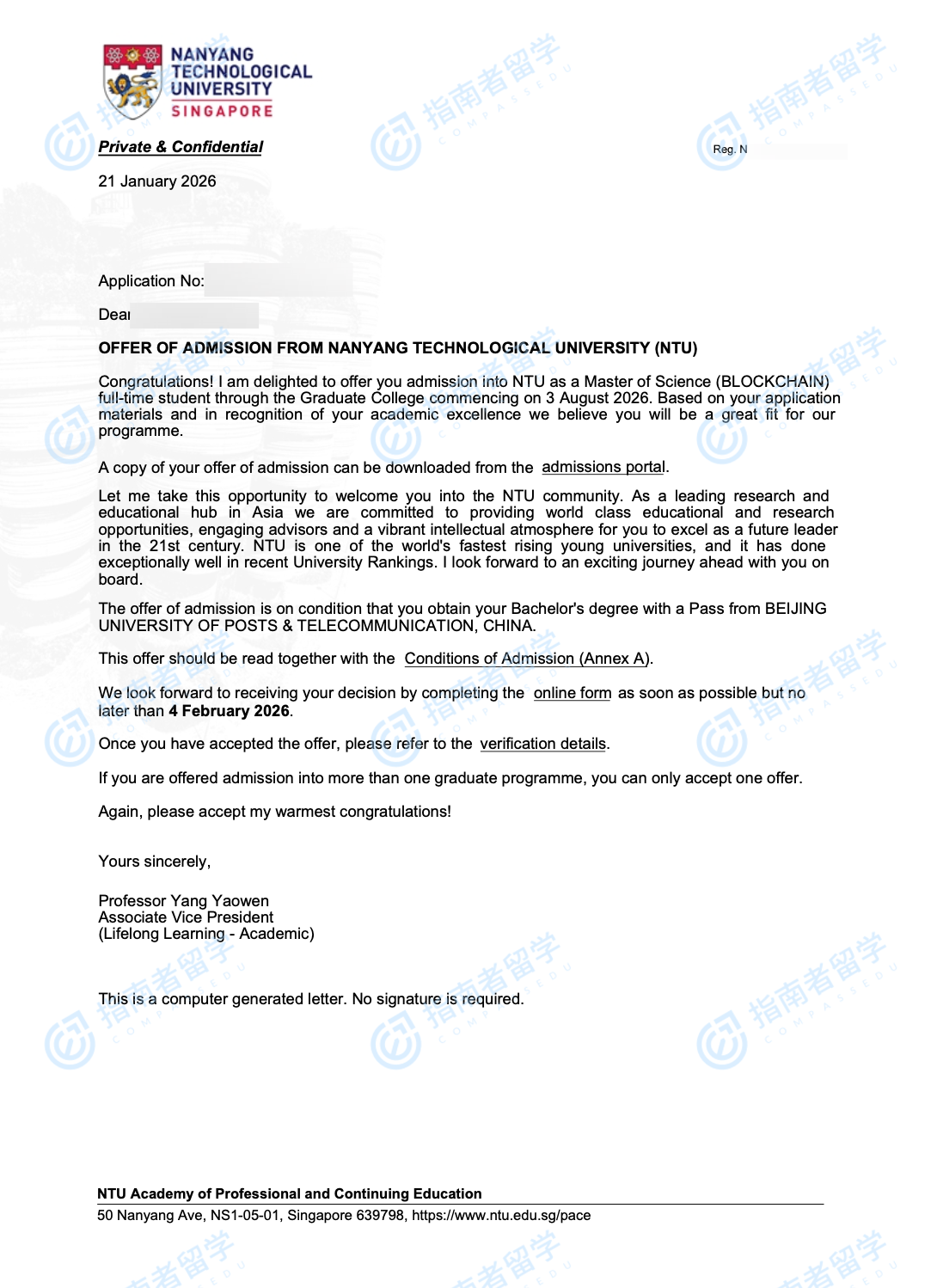 南洋理工大學(xué)區(qū)塊鏈理學(xué)碩士研究生offer一枚