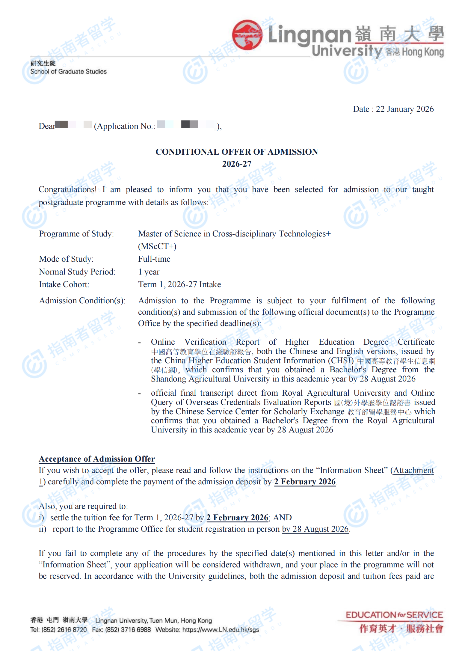 香港嶺南大學融合科技理學碩士+研究生offer一枚