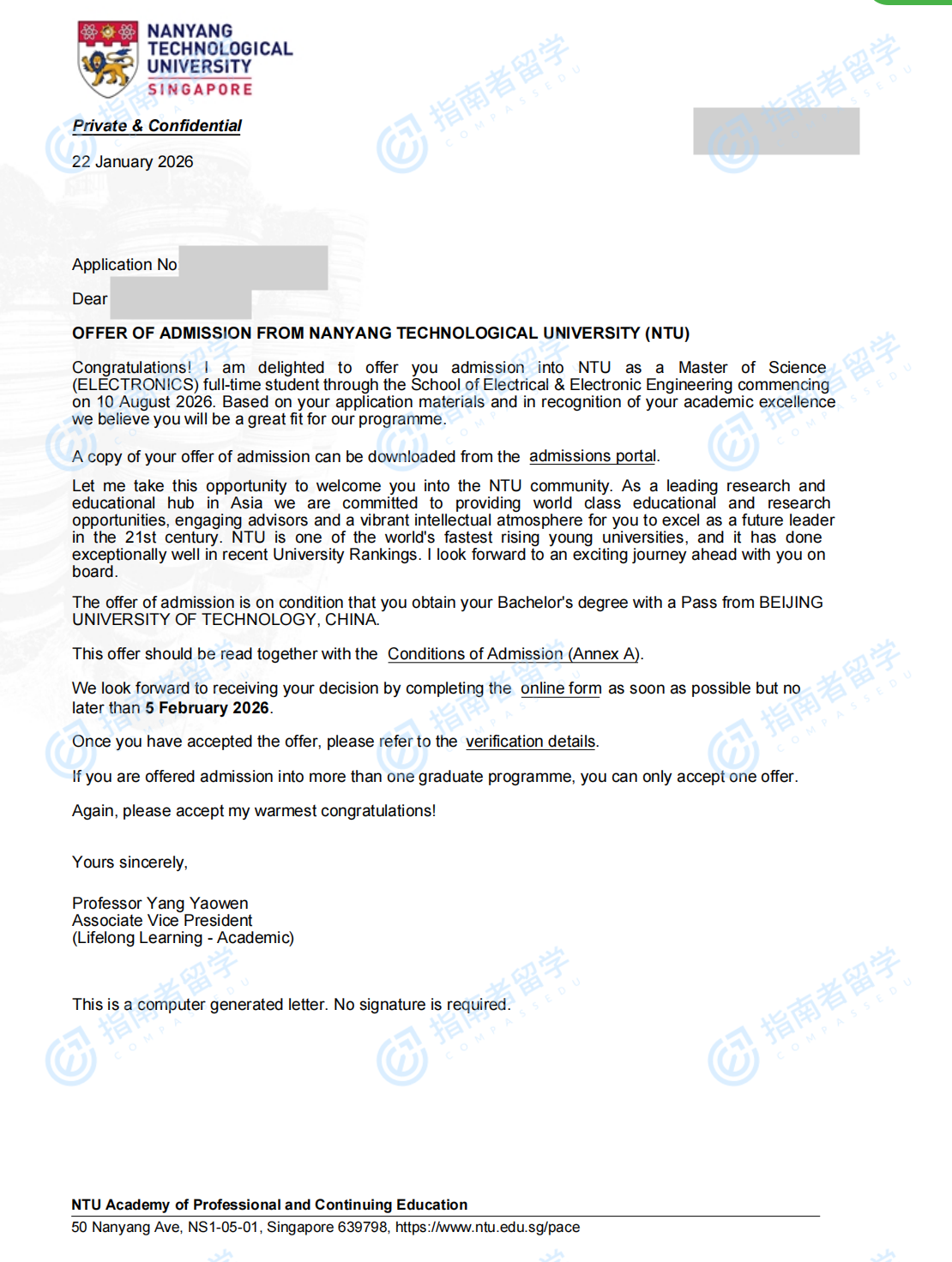 南洋理工大學(xué)電子學(xué)理學(xué)碩士研究生offer一枚