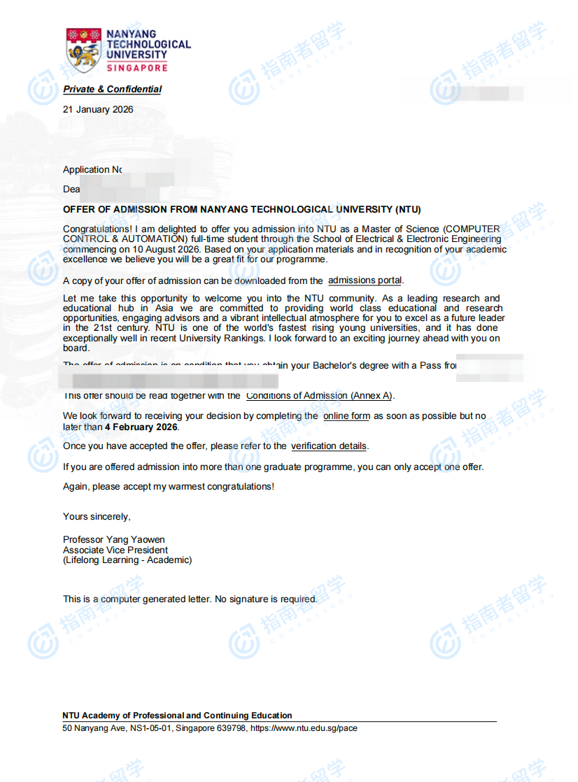 南洋理工大學計算機控制與自動化理學碩士研究生offer一枚