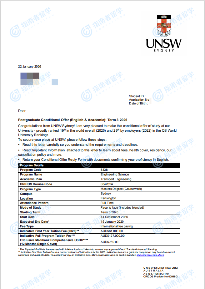 新南威爾士大學(xué)工程科學(xué)碩士(運輸工程)研究生offer一枚