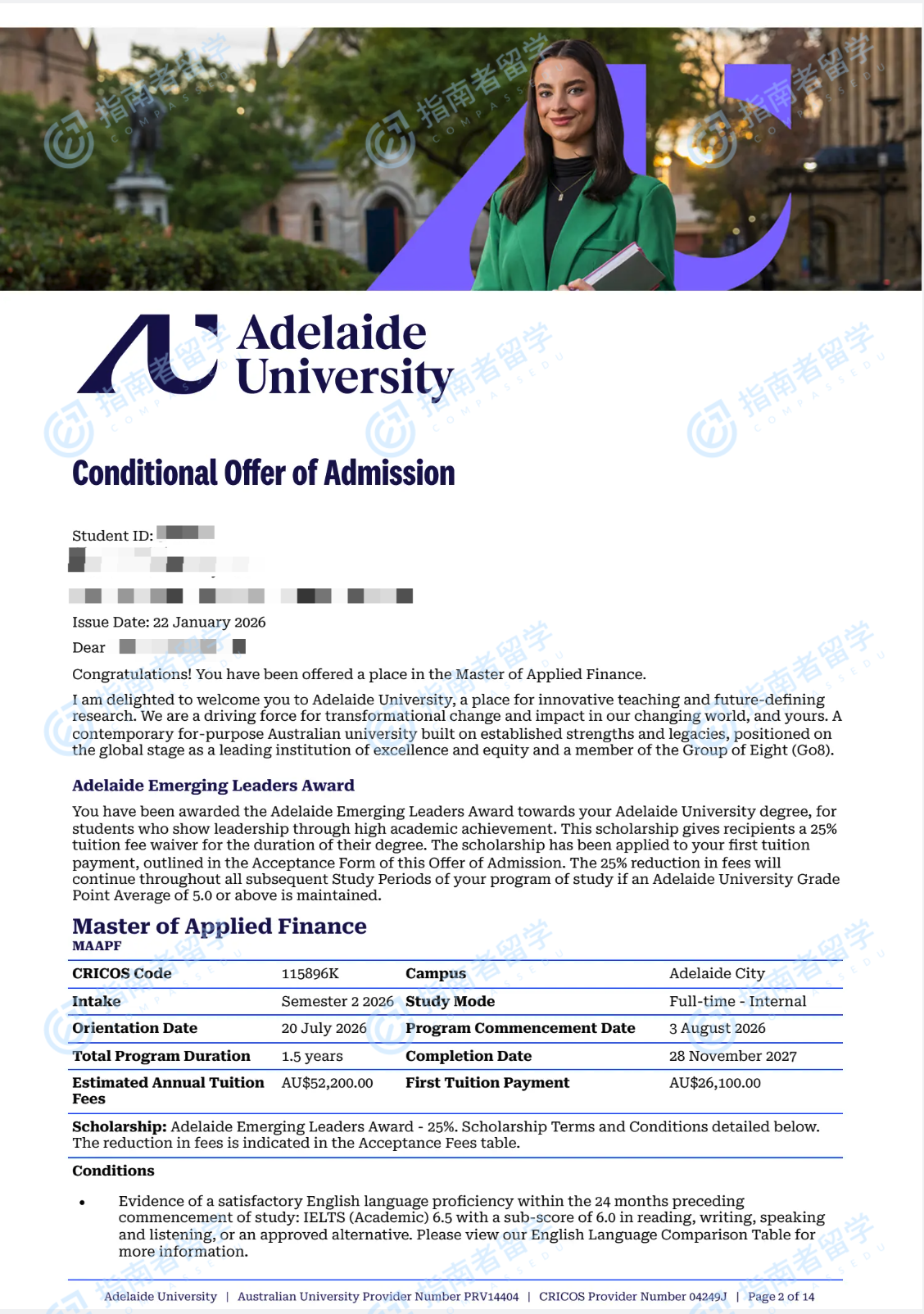 阿德萊德大學(xué)金融學(xué)碩士研究生offer一枚