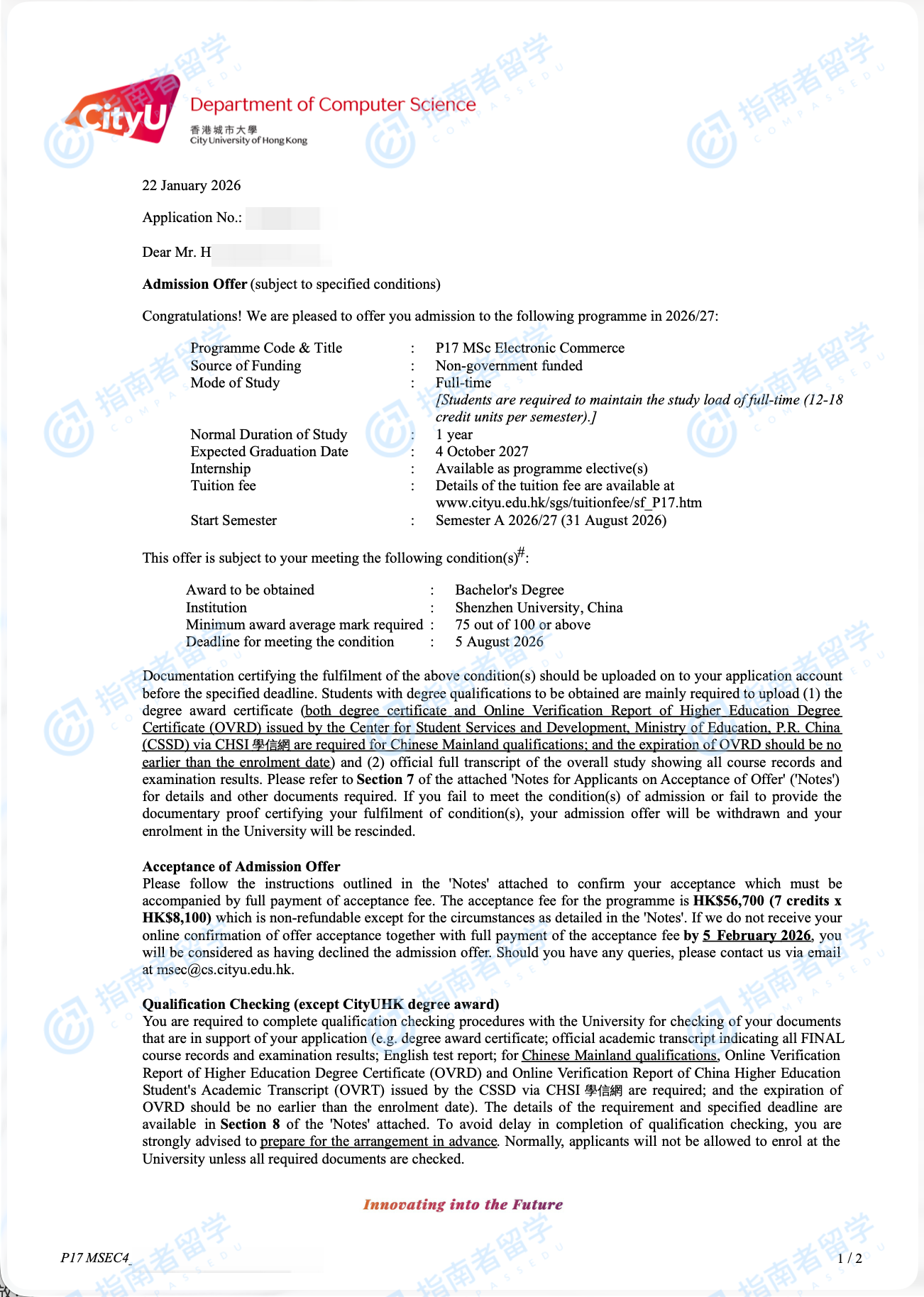 香港城市大學(xué)電子商貿(mào)理學(xué)碩士研究生offer一枚