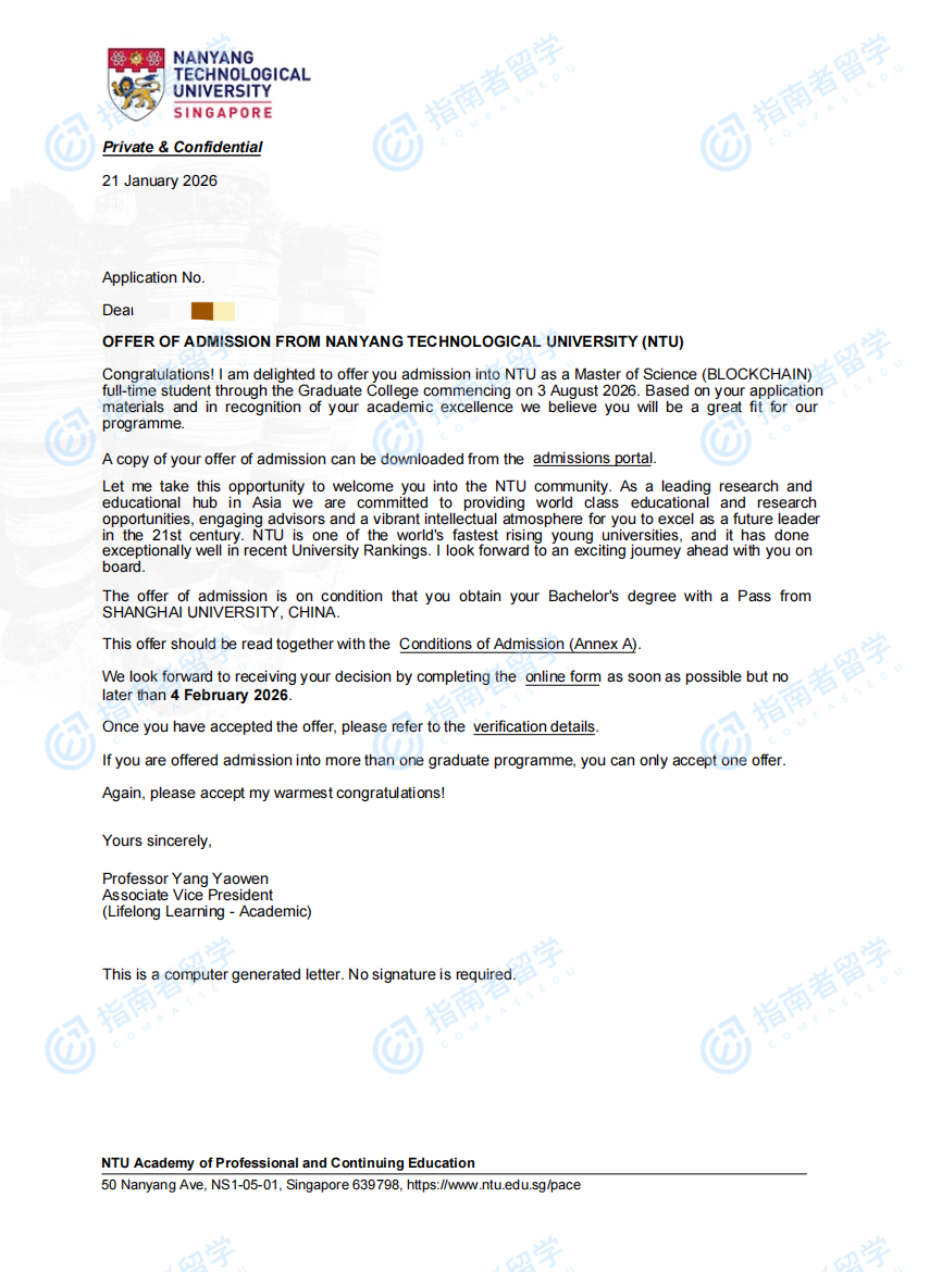 南洋理工大學(xué)區(qū)塊鏈理學(xué)碩士研究生offer一枚