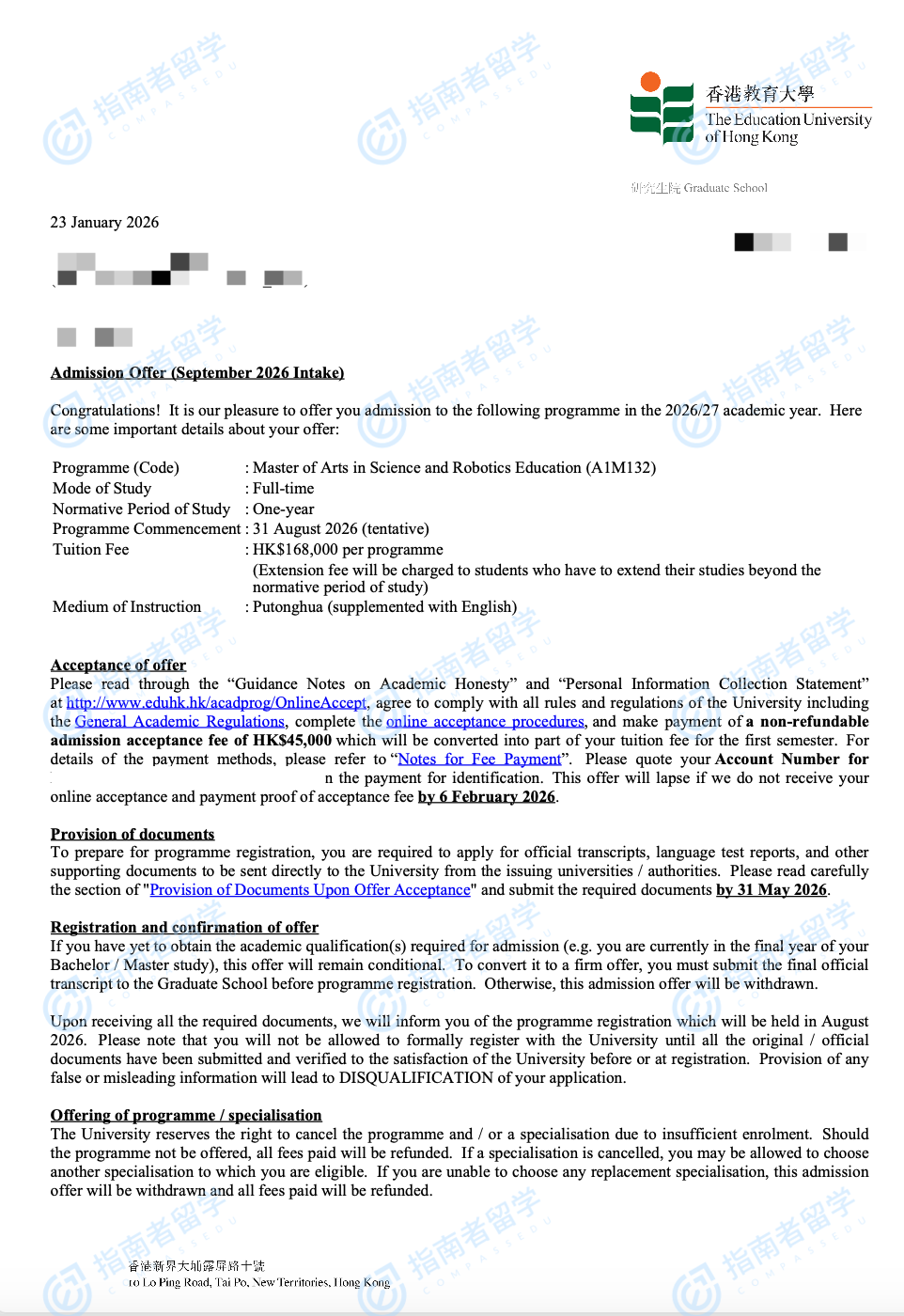 香港教育大學(xué)科學(xué)與機(jī)器人教育文學(xué)碩士研究生offer一枚