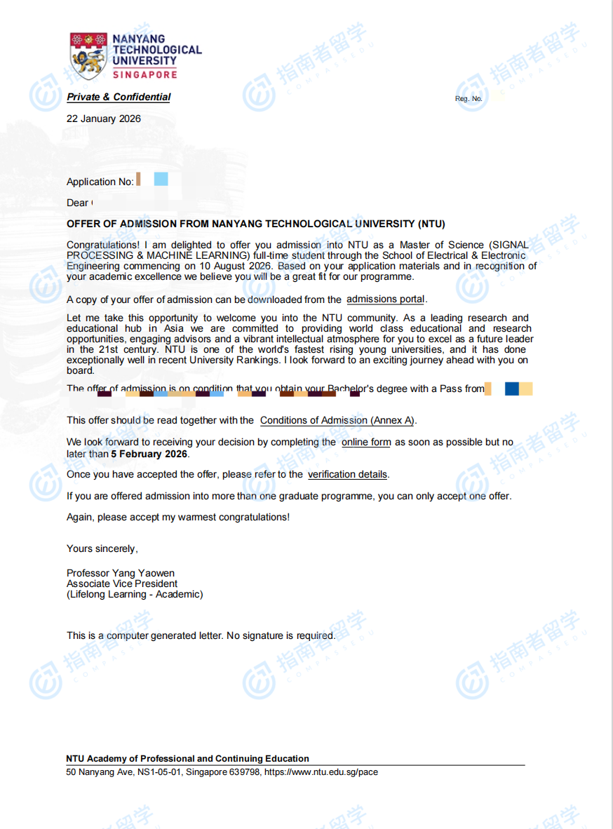南洋理工大學信號處理和機器學習理學碩士研究生offer一枚