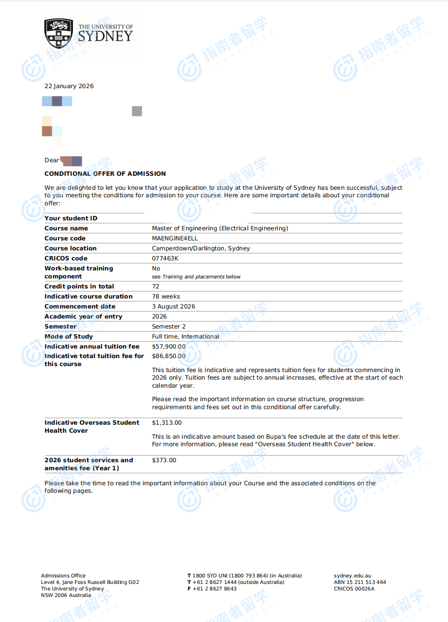 悉尼大學電氣工程工學碩士研究生offer一枚
