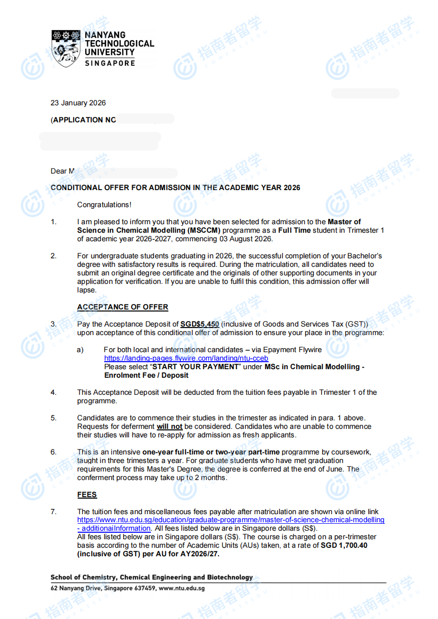 南洋理工大學(xué)化學(xué)建模理學(xué)碩士研究生offer一枚