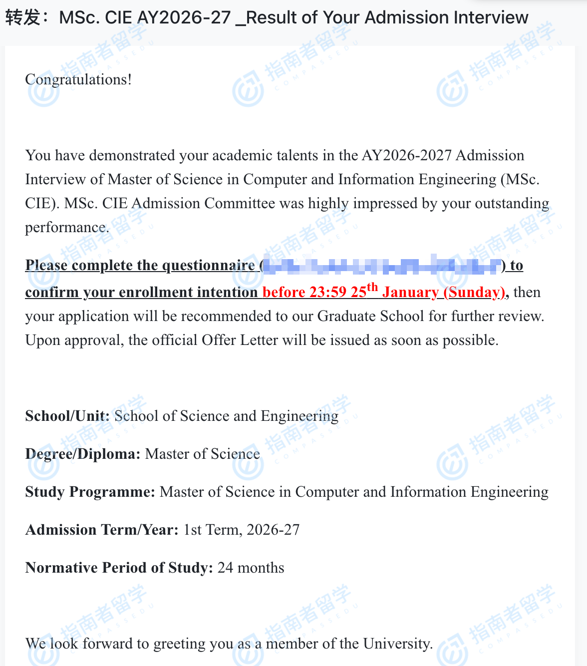 香港中文大學(xué)計(jì)算機(jī)與信息工程理學(xué)碩士(CUHK-Shenzhen)研究生offer一枚