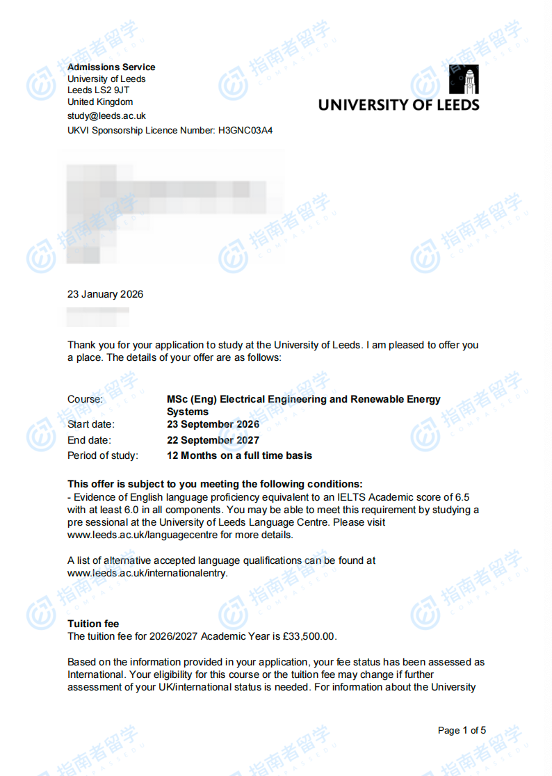 利茲大學(xué)電氣工程與可再生能源系統(tǒng)(工程)理學(xué)碩士研究生offer一枚