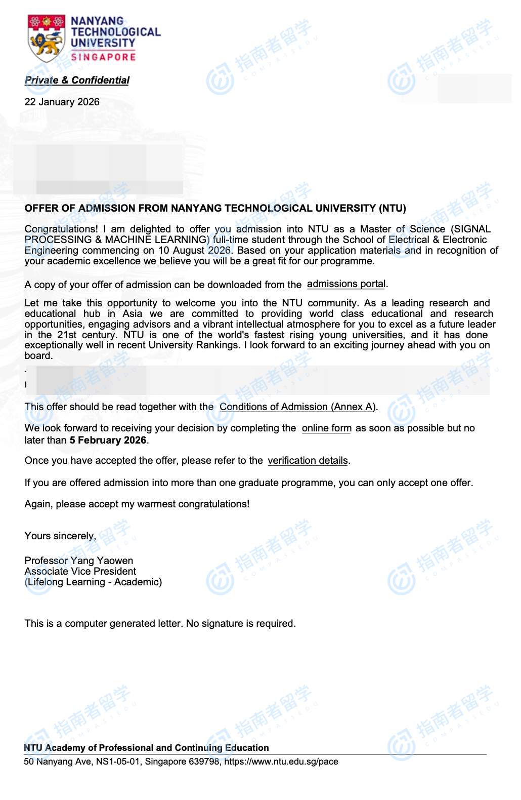 南洋理工大學(xué)信號處理和機(jī)器學(xué)習(xí)理學(xué)碩士研究生offer一枚