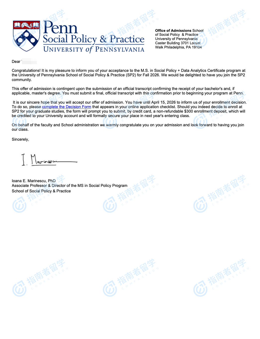 賓夕法尼亞大學(xué)社會政策碩士研究生offer一枚