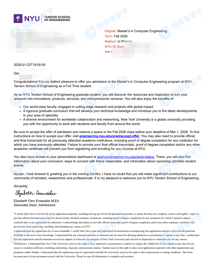 紐約大學(xué)計(jì)算機(jī)工程碩士研究生offer一枚