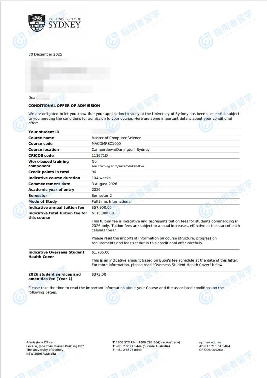 悉尼大學計算機科學碩士研究生offer一枚