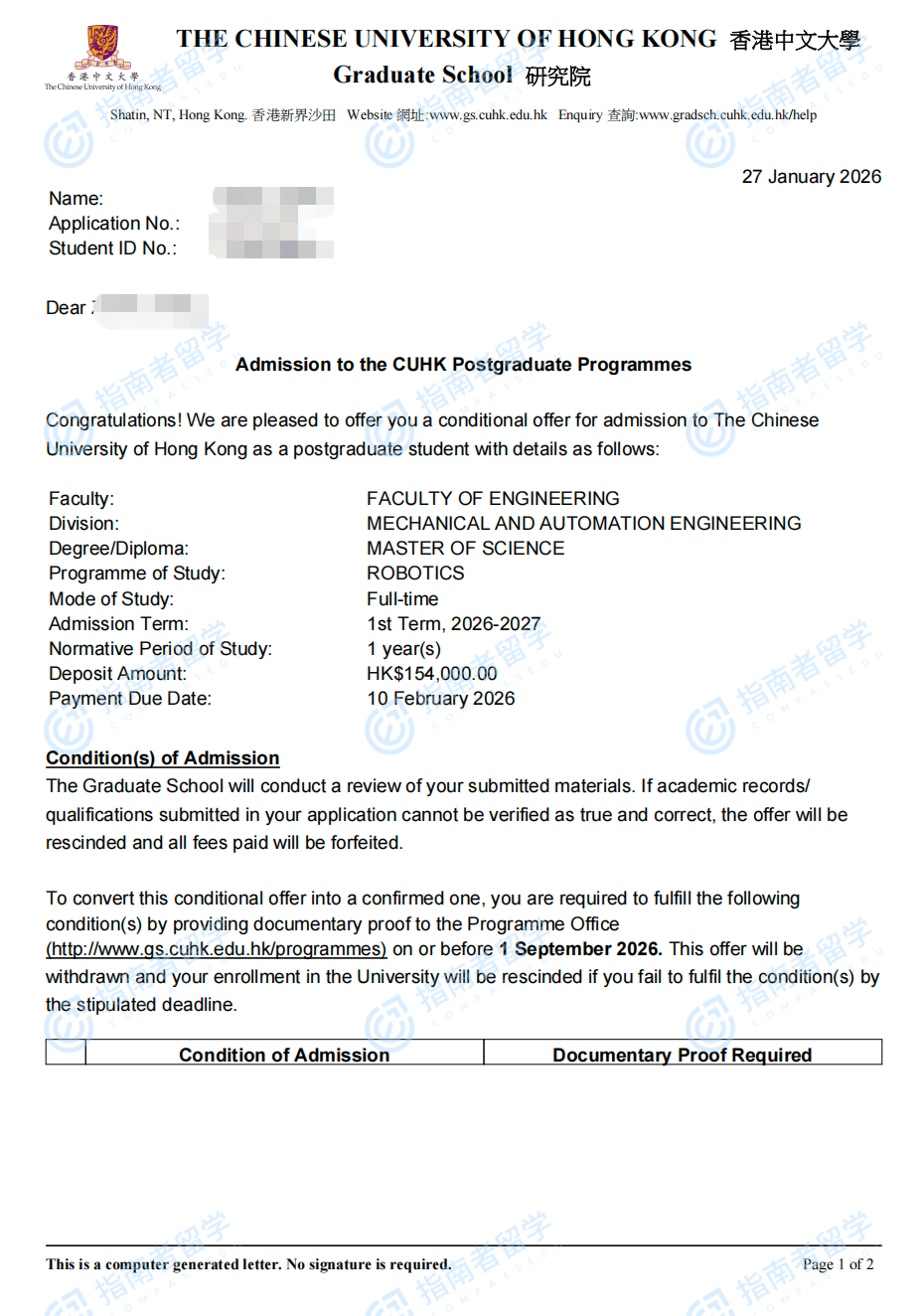 香港中文大學(xué)機(jī)器人學(xué)理學(xué)碩士研究生offer一枚