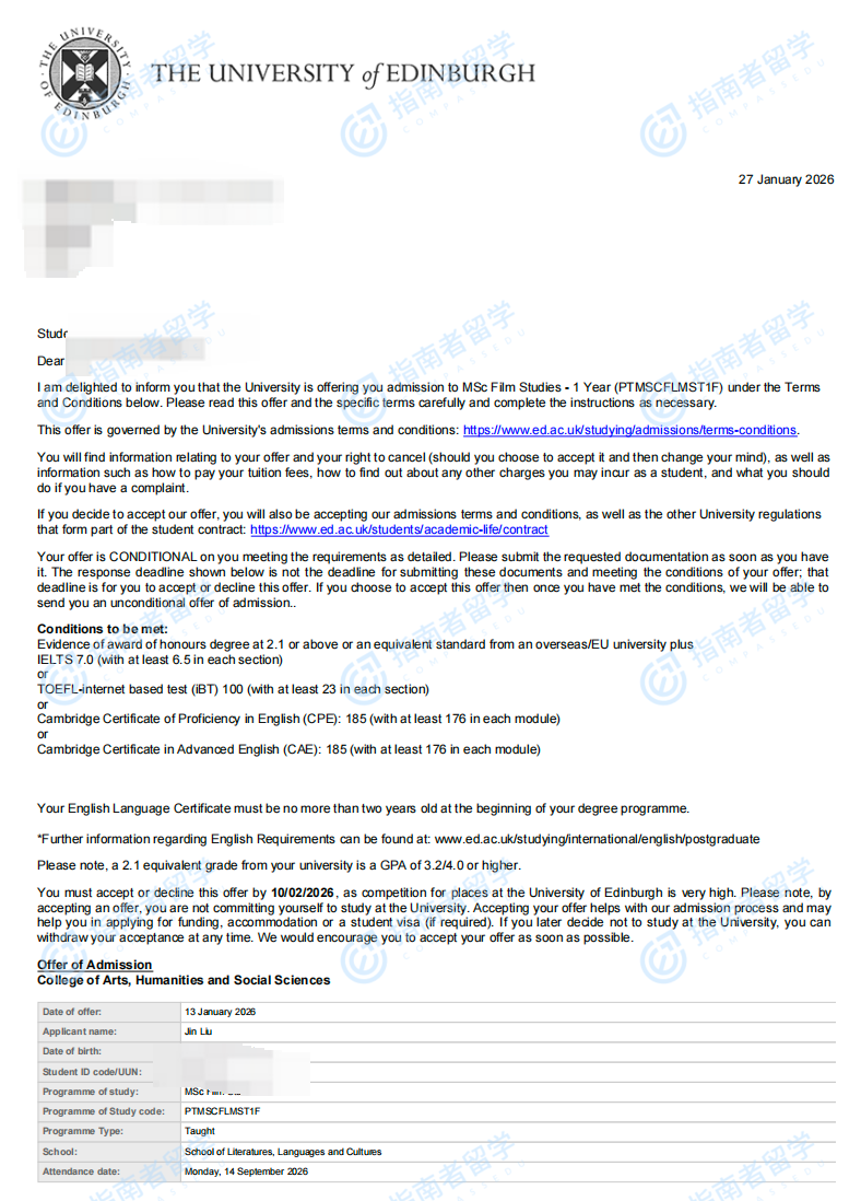 愛丁堡大學(xué)電影研究理學(xué)碩士研究生offer一枚