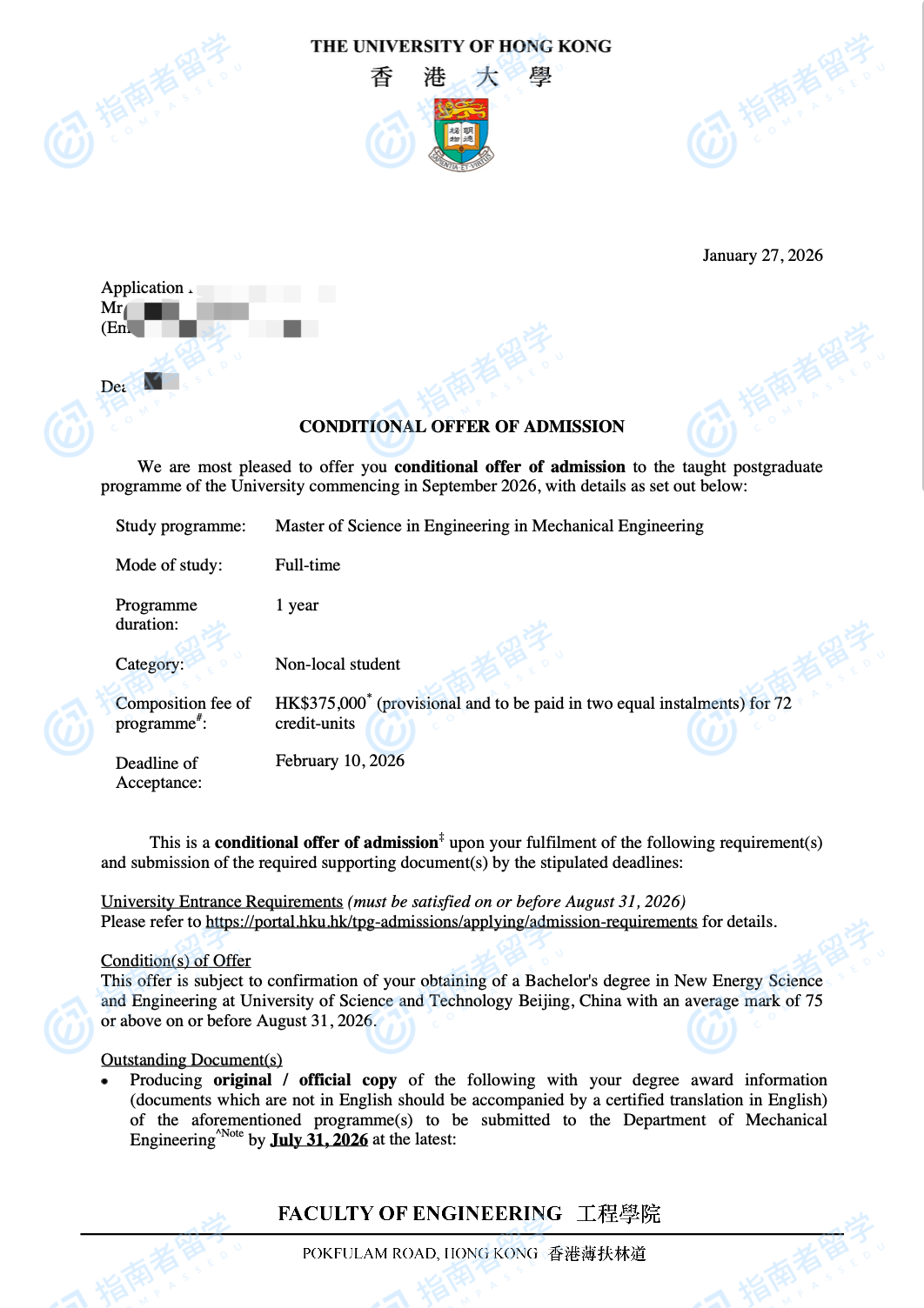 香港大學機械工程(工程)理學碩士研究生offer一枚