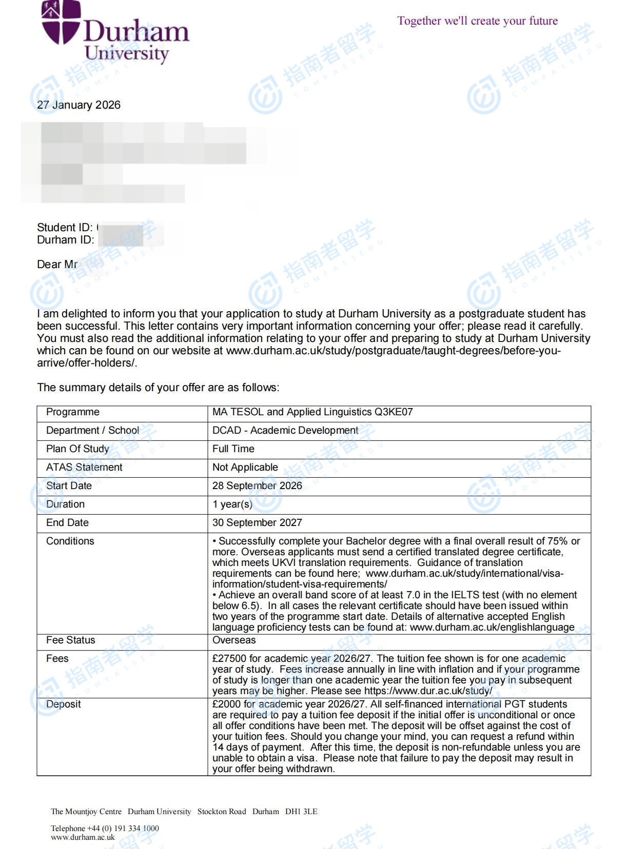 杜倫大學(xué)教育學(xué)文學(xué)碩士研究生offer一枚