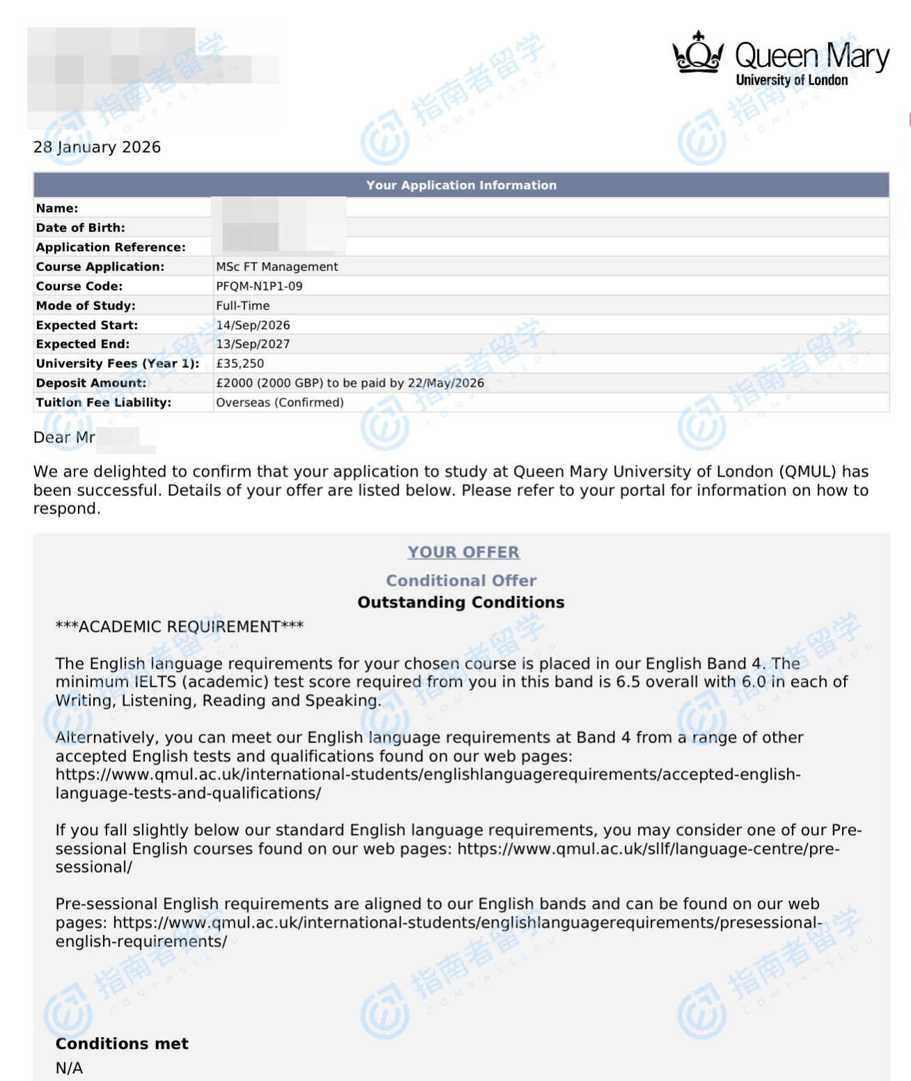 倫敦大學(xué)瑪麗皇后學(xué)院管理學(xué)理學(xué)碩士研究生offer一枚