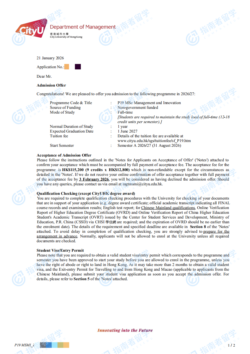 香港城市大學(xué)管理與創(chuàng)新理學(xué)碩士研究生offer一枚