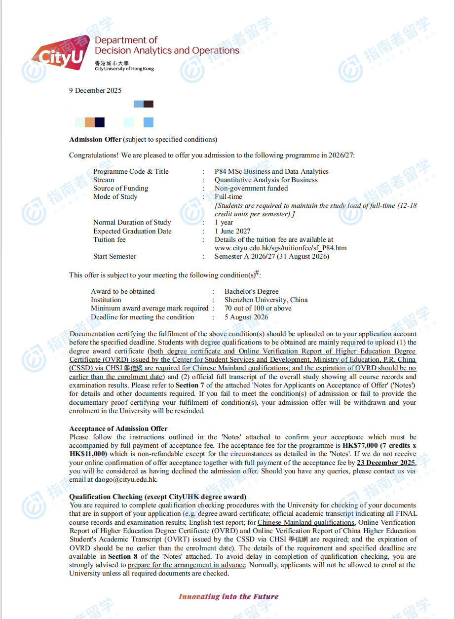 香港城市大學(xué)商業(yè)及數(shù)據(jù)分析理學(xué)碩士研究生offer一枚