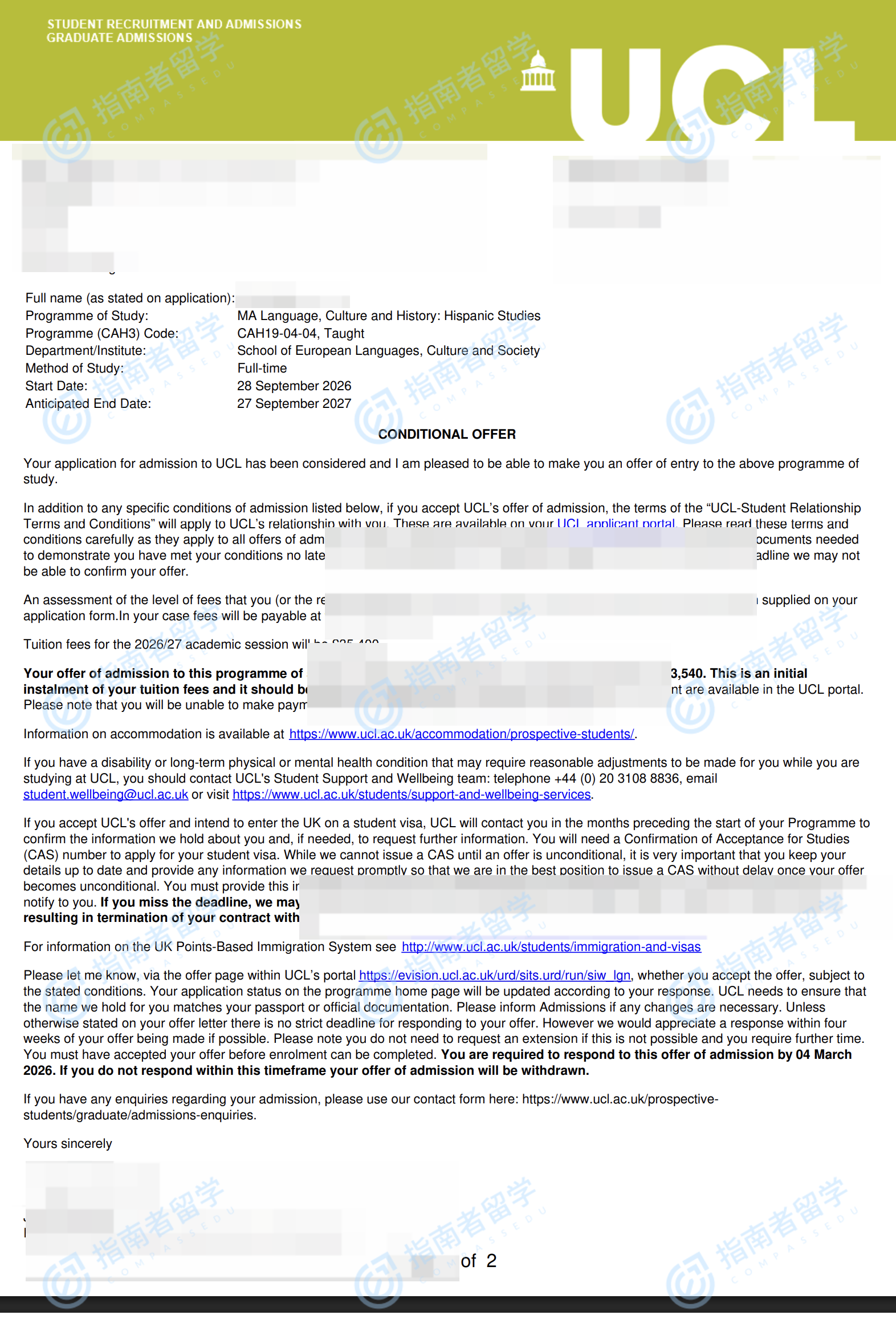 倫敦大學(xué)學(xué)院語言、文化與歷史(西班牙研究)文學(xué)碩士研究生offer一枚