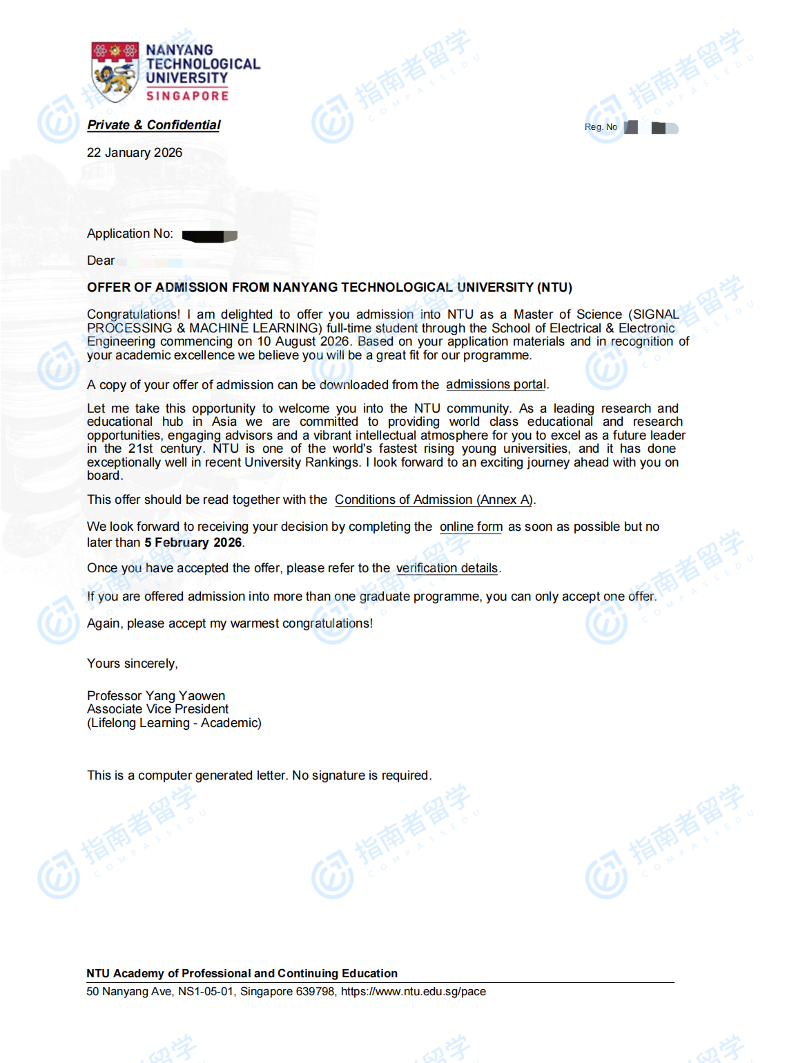 南洋理工大學(xué)信號處理和機(jī)器學(xué)習(xí)理學(xué)碩士研究生offer一枚