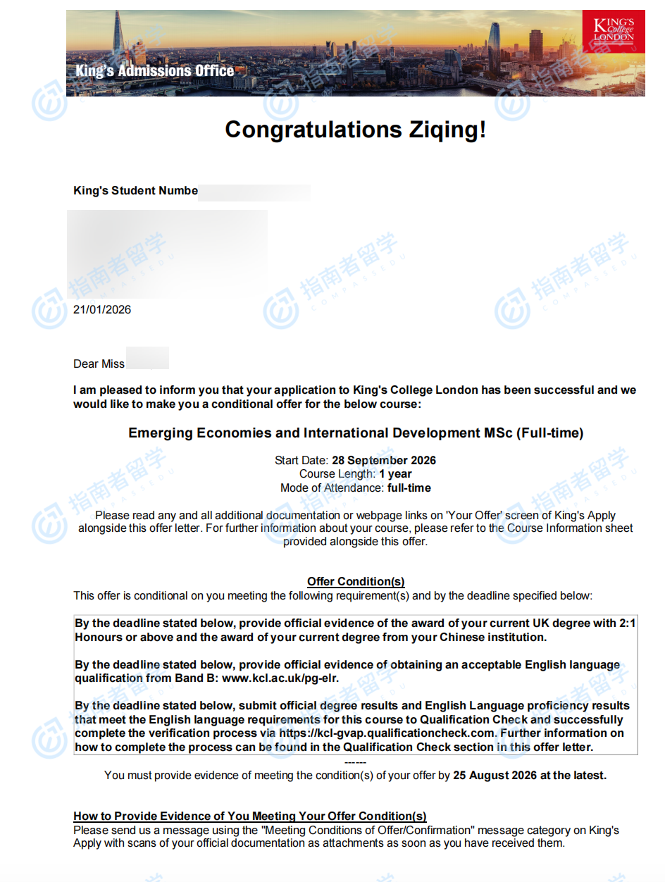 倫敦大學(xué)國王學(xué)院新興經(jīng)濟(jì)體與國際發(fā)展理學(xué)碩士研究生offer一枚