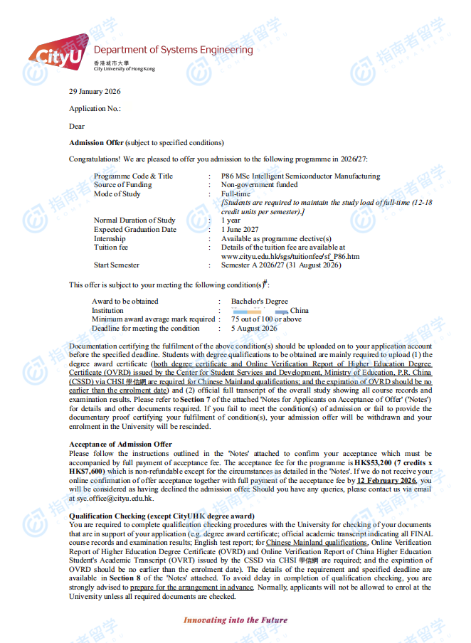 香港城市大學(xué)智能半導(dǎo)體制造理學(xué)碩士研究生offer一枚