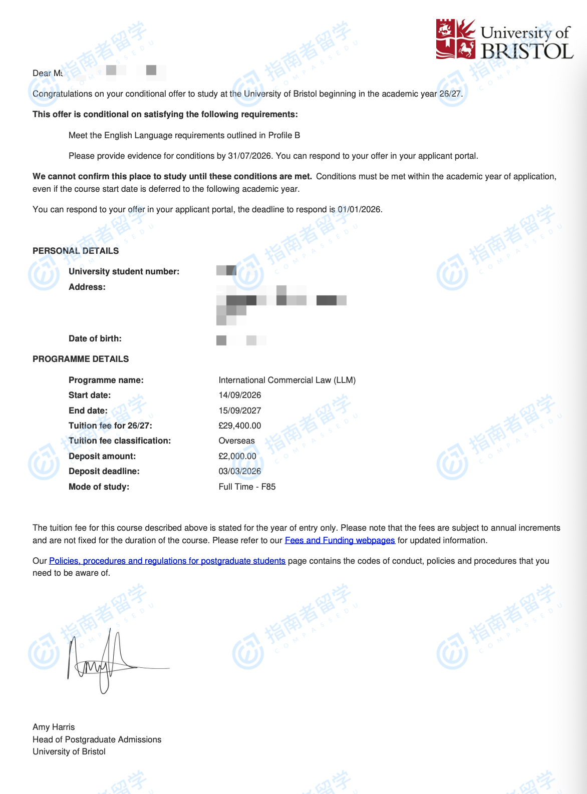布里斯托大學(xué)國際商法法學(xué)碩士研究生offer一枚
