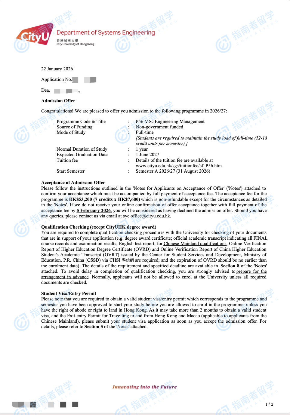 香港城市大學(xué)工程管理學(xué)理學(xué)碩士研究生offer一枚