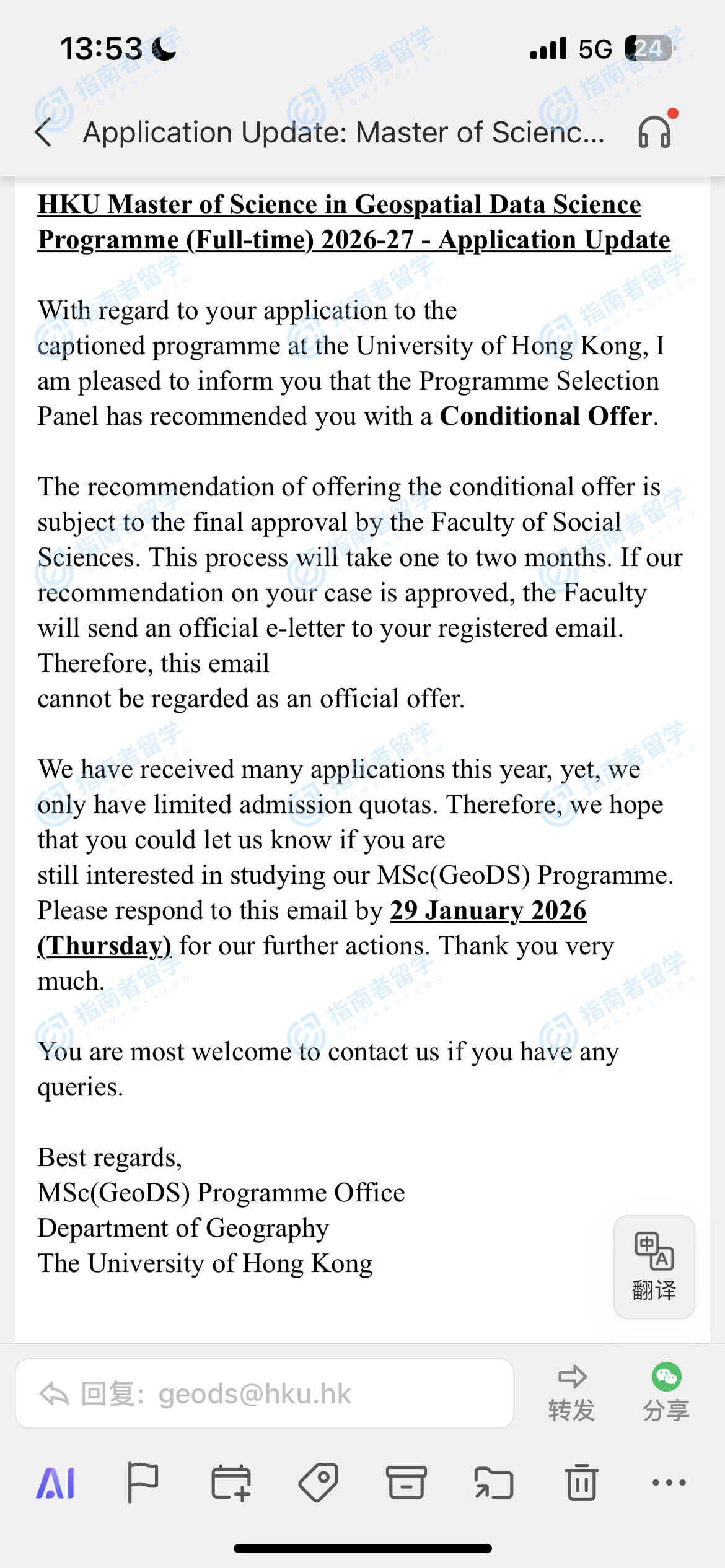 香港大學(xué)地理空間數(shù)據(jù)科學(xué)理學(xué)碩士研究生offer一枚